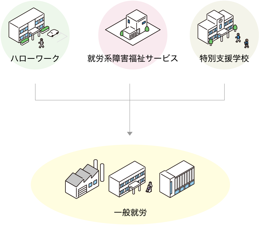 障害者が一般の企業に就職(一般就労)するルートは様々ですが、大きく分類すると特別支援学校、ハローワーク、障害福祉サービスからです。